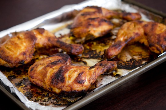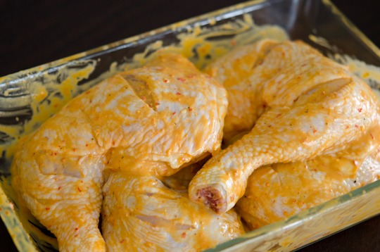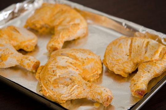 Pour 1/4 cup of sauce over chicken legs and spread all over. I scored chicken so the flavor will penetrate better to the meat. Marinade at least 1 hr. Overnight is even better.