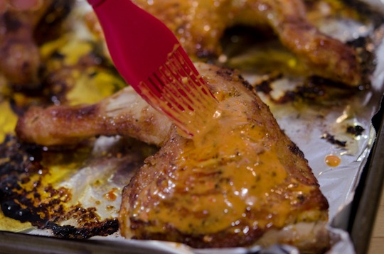 Bake them in an hot oven (425F) for 20-25minutes, baste with more sauce as you turn the chickens to the other side.